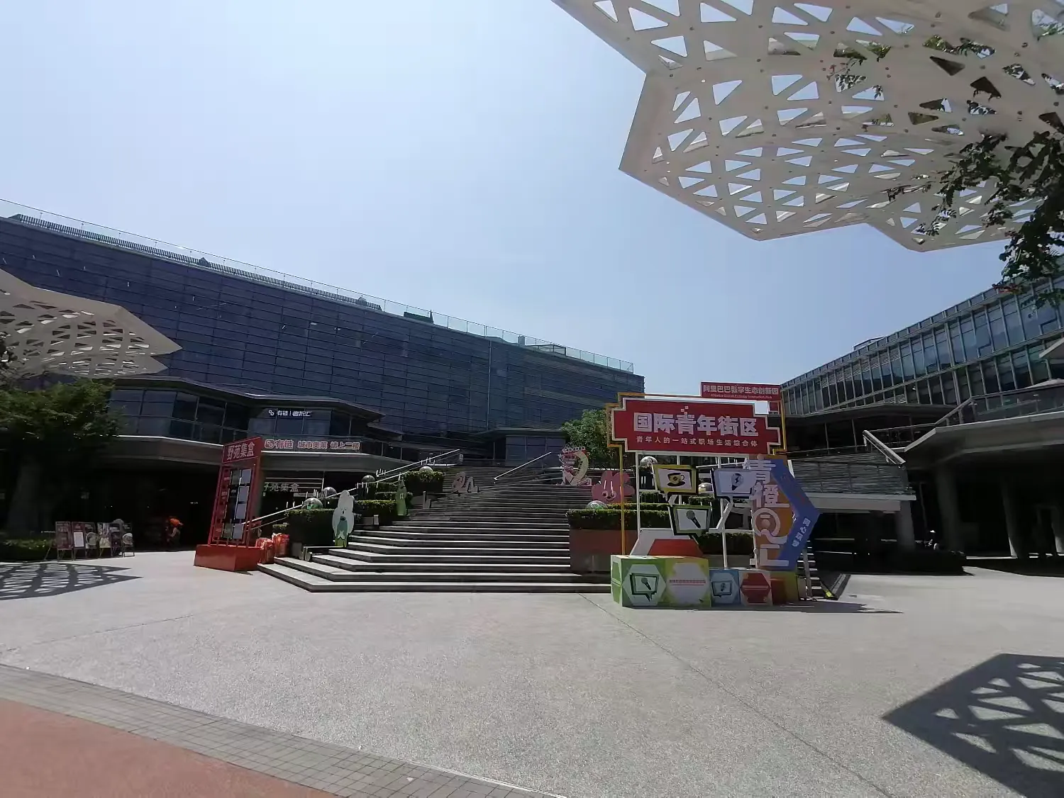作为全球知名企业的重要办公基地,阿里巴巴西溪数字生态创新园(B区)从外部环境到内部空间都展现出独特的设计理念与企业气质。园区外部以醒目的国际合作标识与现代建筑相映成趣,传递着开放包容的企业形象。