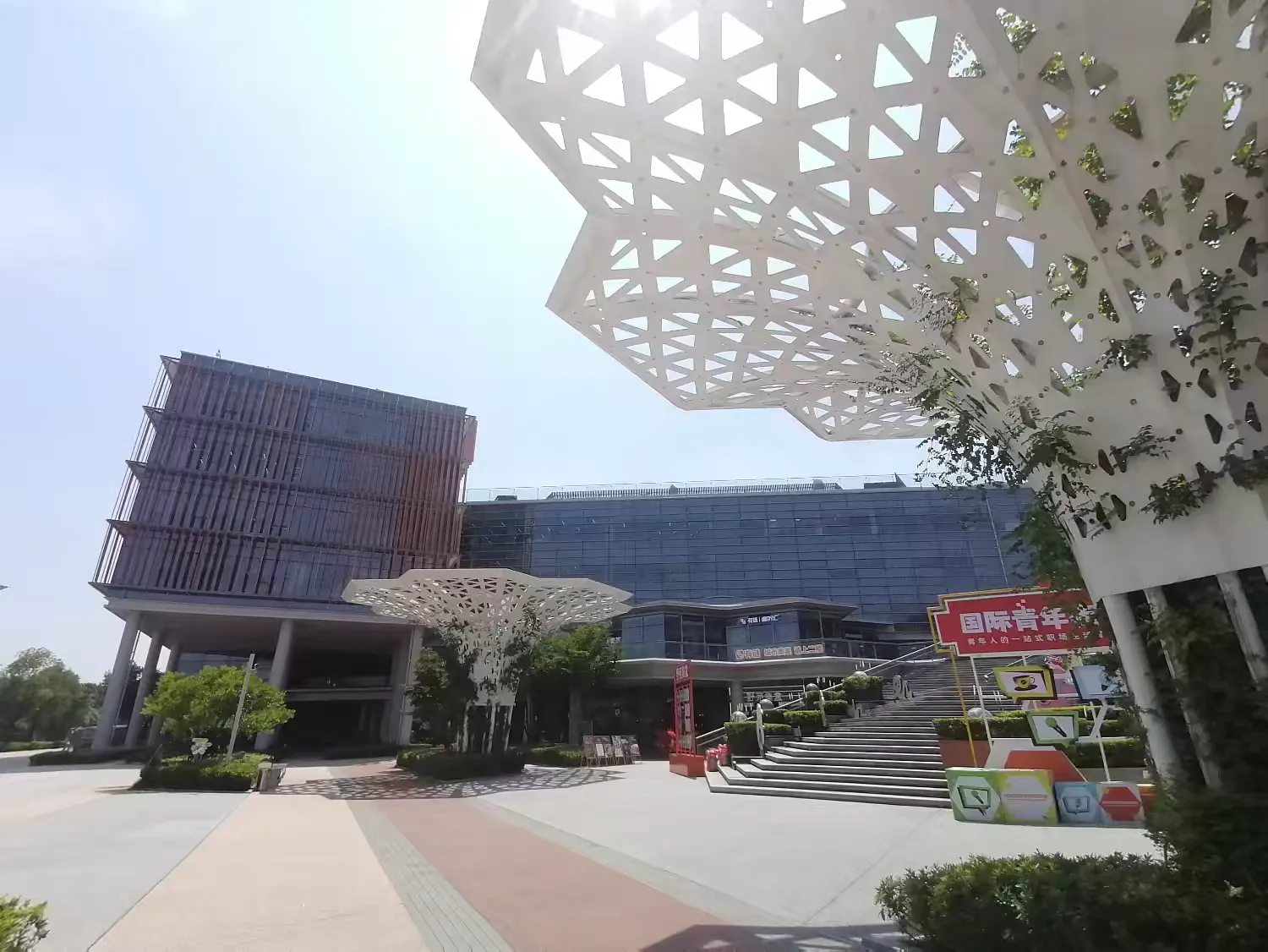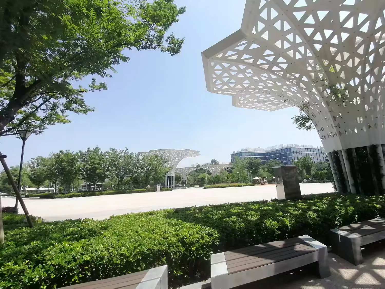 园区内的公共区域注重自然与现代的融合,无论是造型独特的装饰结构,还是整洁的步道与休憩长椅,都为员工和访客提供了舒适的户外交流空间。